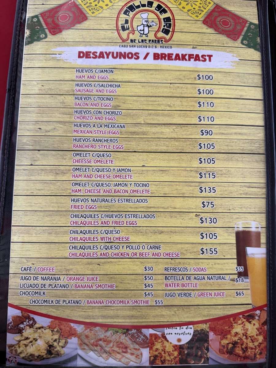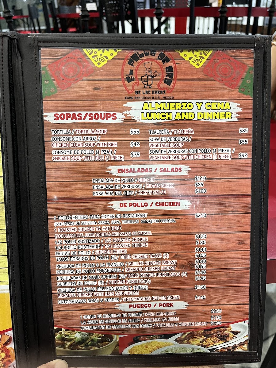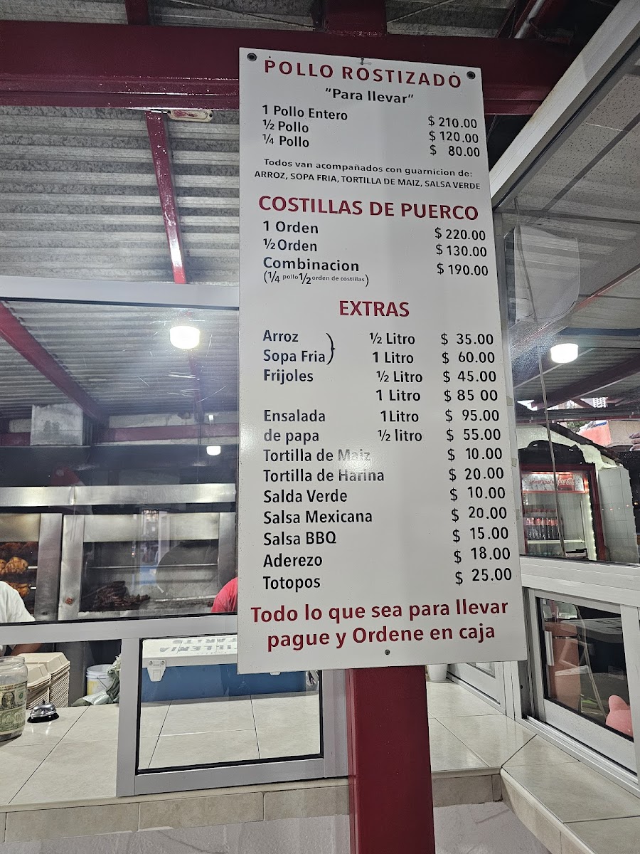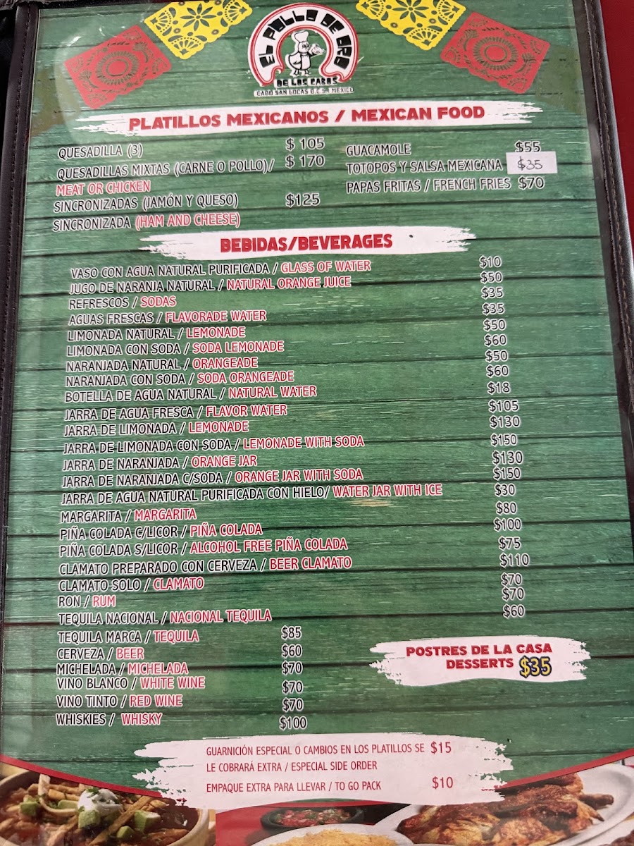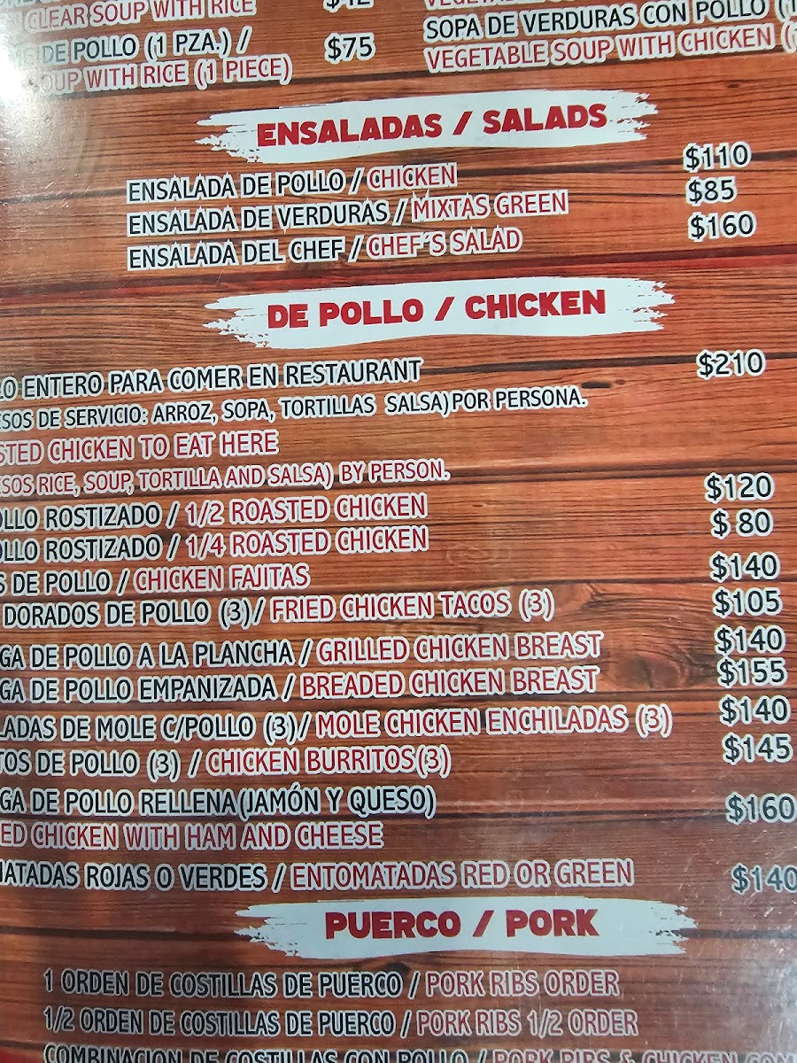 The menu at El Pollo de Oro features a variety of traditional Mexican dishes, with a primary focus on chicken and ribs. Guests can find a selection of combination plates that pair these proteins with classic sides and flour tortillas. The menu also includes several breakfast options such as Huevos Rancheros and Huevos a la Mexicana, suitable for morning dining.