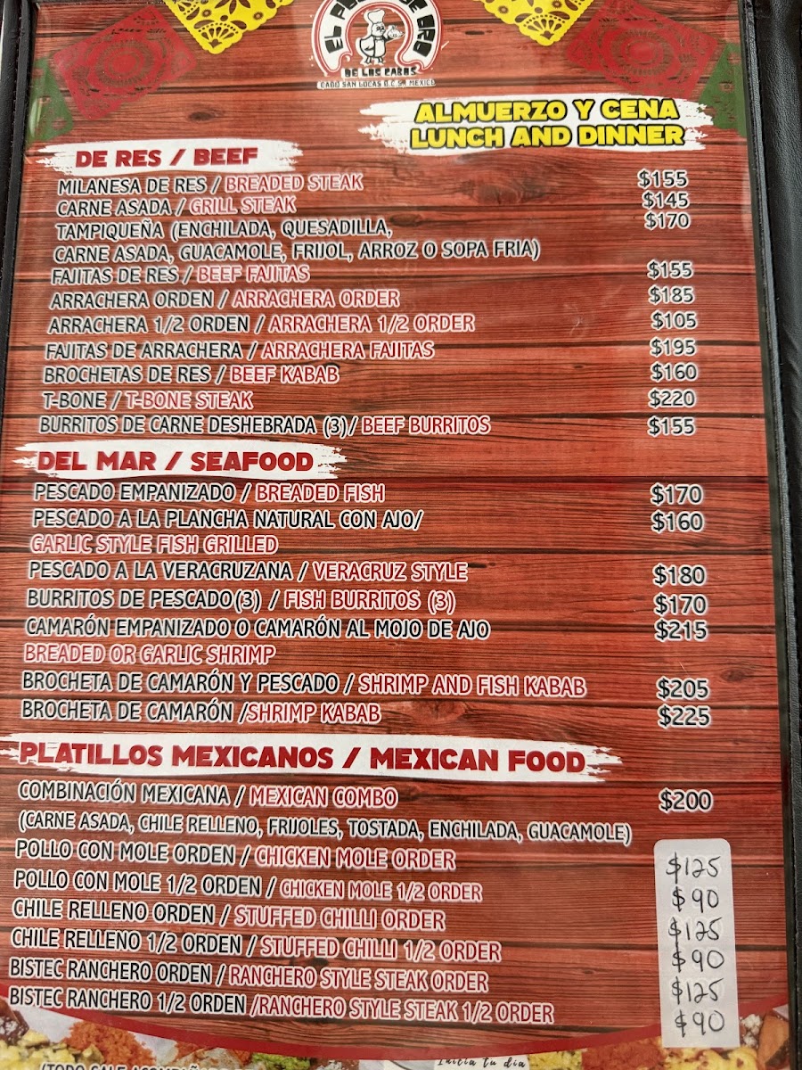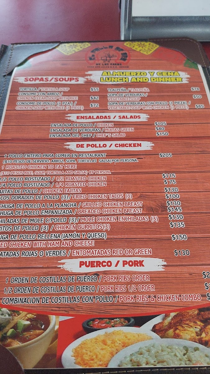 In addition to main dishes, the menu offers soups like tortilla soup and various preparations of pork ribs and beef, including Bistec Ranchero. There are also Mexican staples such as Chiles Rellenos served with garnishes. For beverages, options include Piña Colada, Limonada, and Michelada, complementing both meal times and casual refreshments.